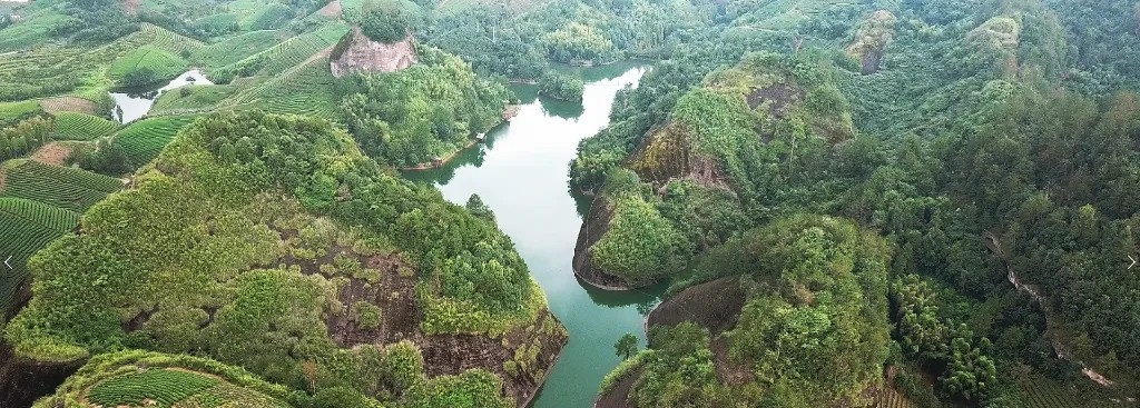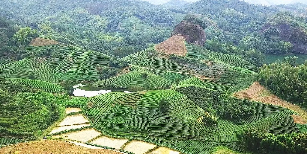 陣陣清風(fēng),吹過一片片稻田;山野之間,一座座錯(cuò)落有致的茶園綠意盎然,丹霞山馮、丘陵、果園、老屋……隱藏在一方綠意蔥蘢的小天地之中,隱約傳來“嘩嘩嘩”的溪水聲……