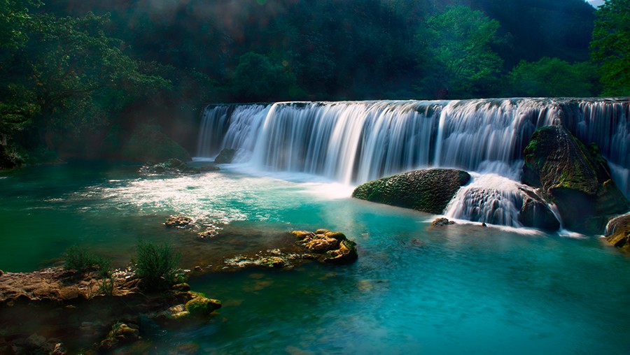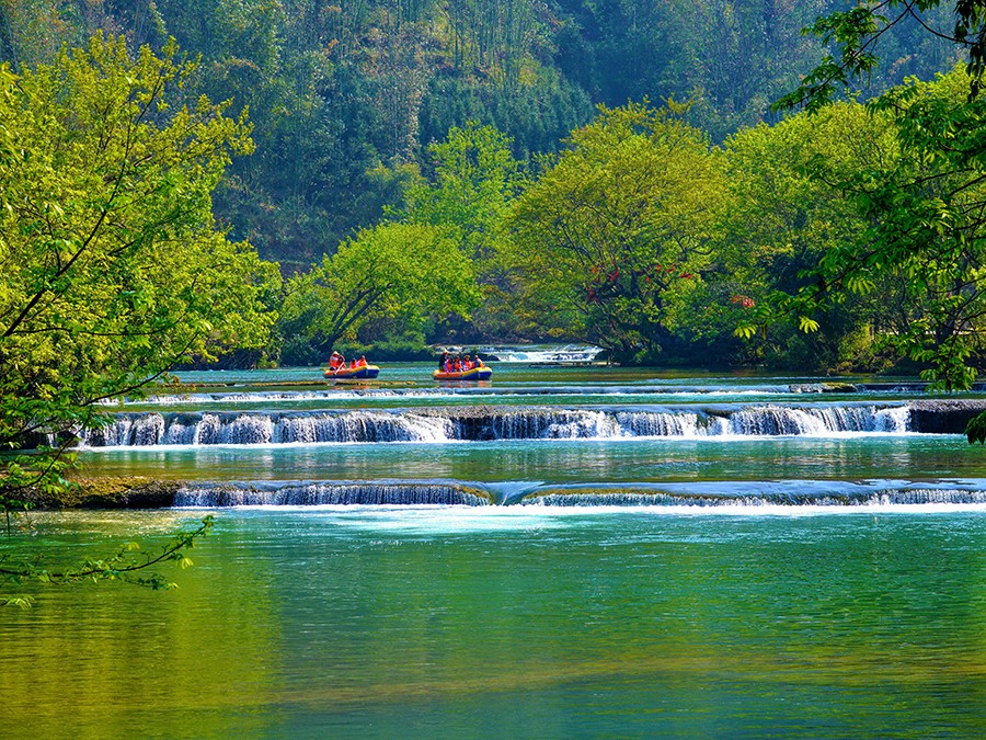 全長(zhǎng)12公里的河道上,分布著40多個(gè)瀑布、疊水、鈣化灘,十彎九迭,河水剔透晶藍(lán),布依村寨沿河而布。