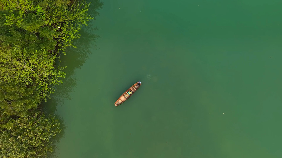 兩岸古榕參天,翠竹遍地,河水剔透碧藍(lán),清澈見(jiàn)底,遠(yuǎn)山近水倒映其間,美不勝收。