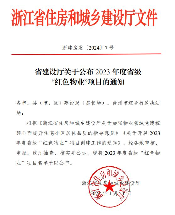 浙江省住房和城鄉(xiāng)建設(shè)廳發(fā)布《關(guān)于公布 2023年度省級“紅色物業(yè)”項目的通知》(浙建房發(fā)〔2024〕7號)中御上江南小區(qū)物業(yè)服務(wù)項目獲評2023年度省級“紅色物業(yè)”項目。