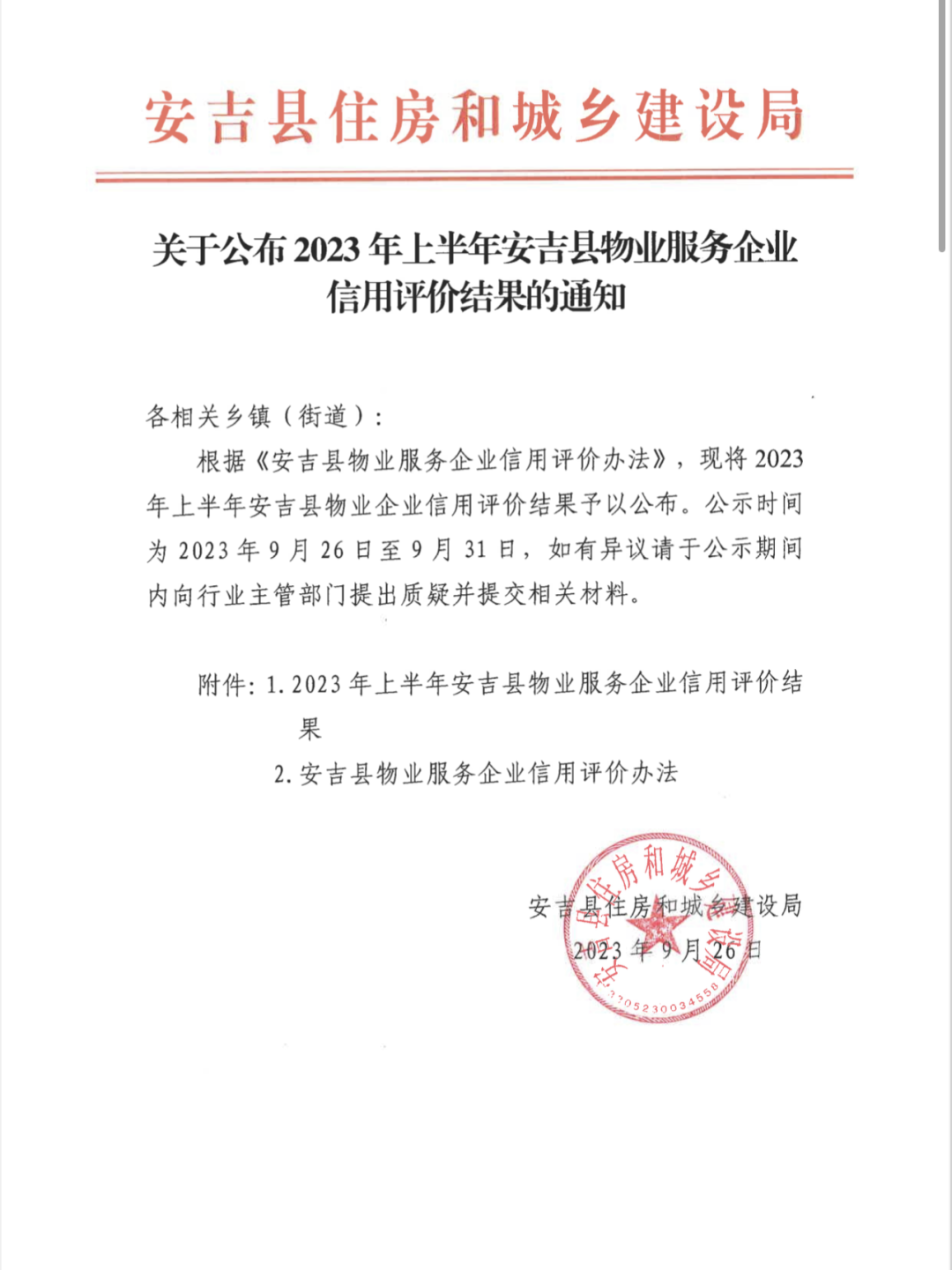 在安吉縣住房和城鄉(xiāng)建設(shè)局,關(guān)于公布2023年上半年安吉縣物業(yè)服務(wù)企業(yè)信用評價結(jié)果的通知中嘉興安甬物業(yè)服務(wù)有限公司為紅榜企業(yè)。